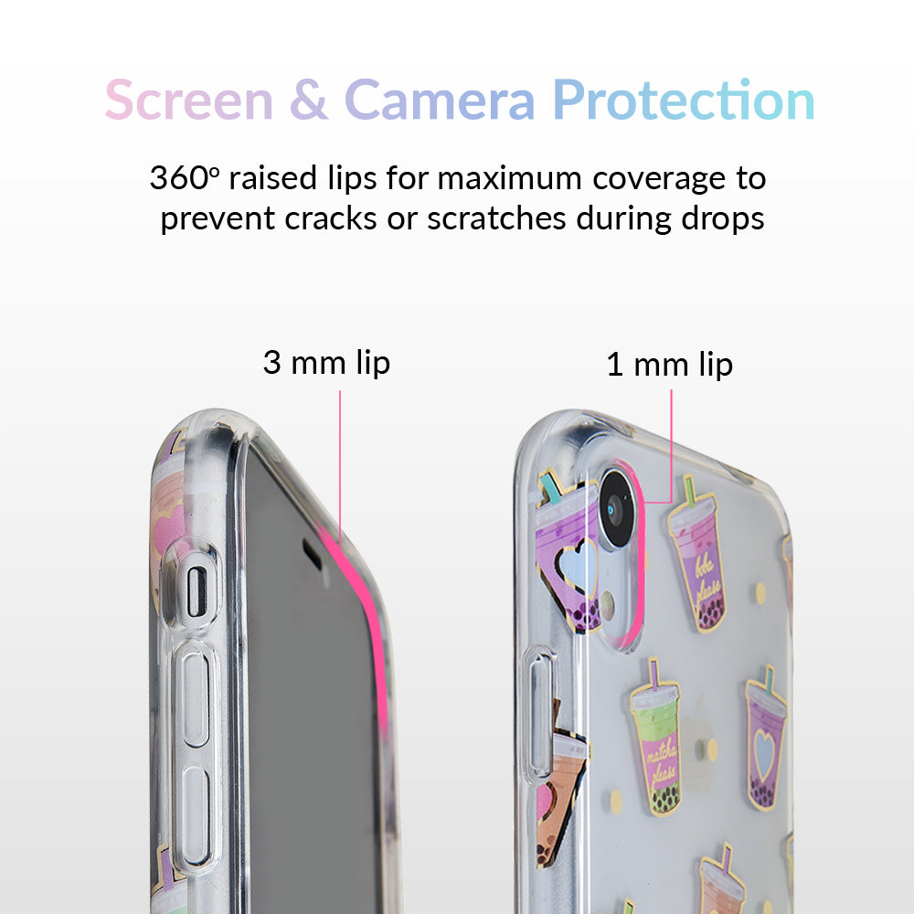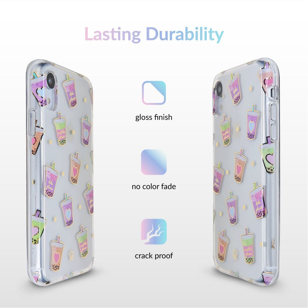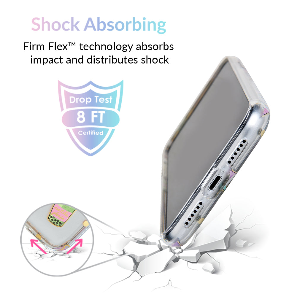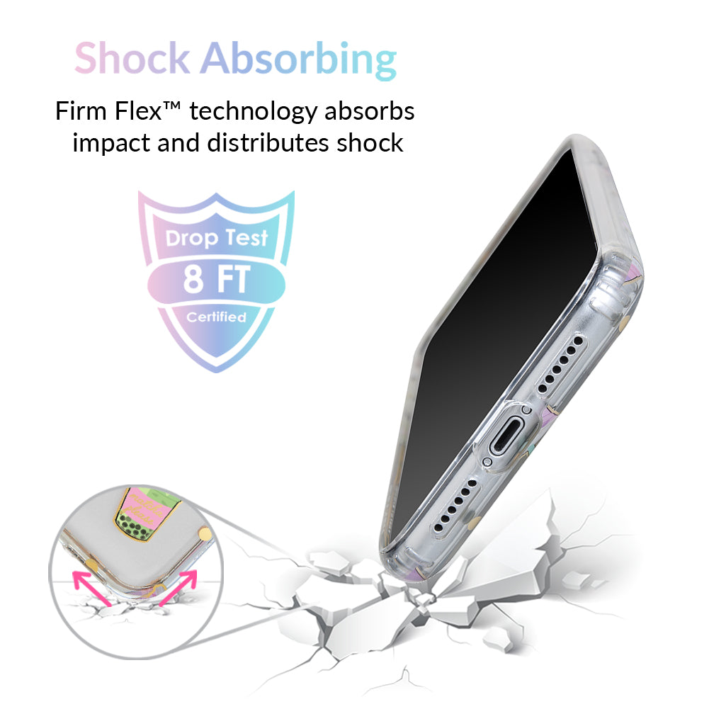 Nothing can bring you down when you’ve got cups of iced Matcha! This protective, clear case has a super cute Matcha pattern featuring iced Matcha, to-go cups, and boba pearls! It comes in a gloss finish, gold chrome outlines, and a matching clear bumper for added protection against drops.