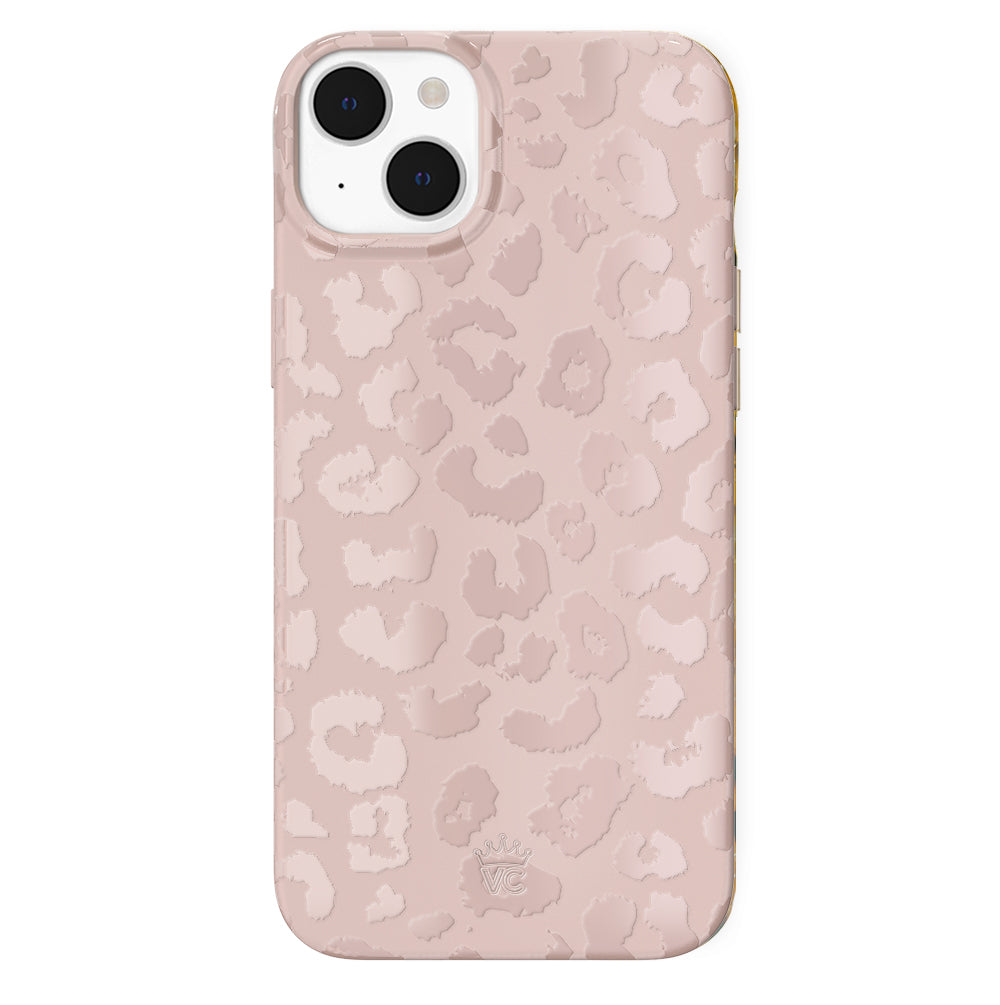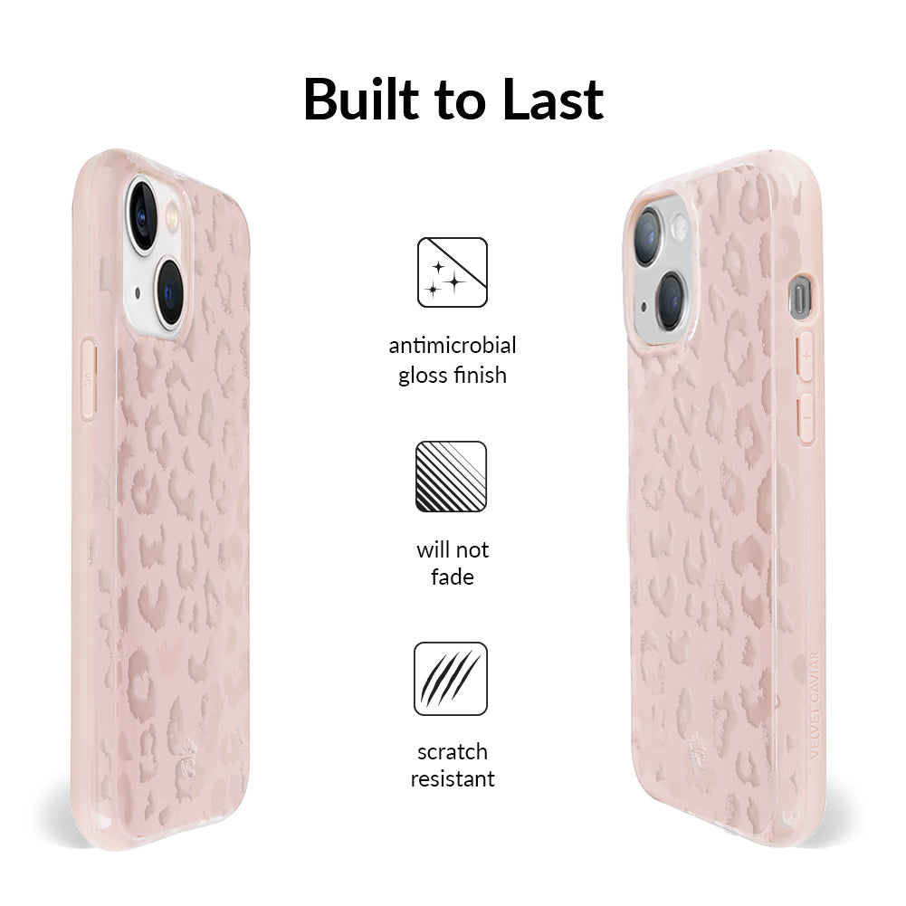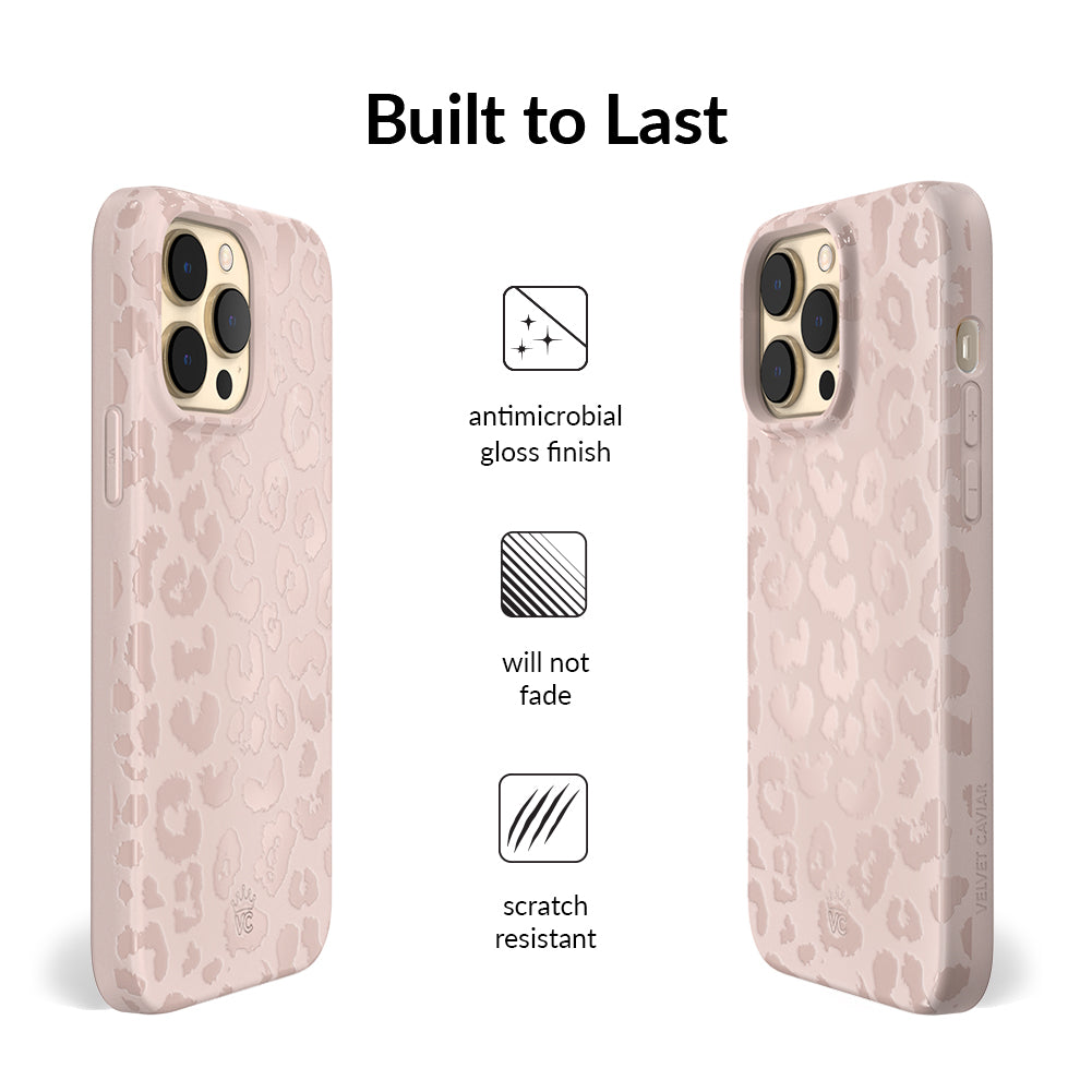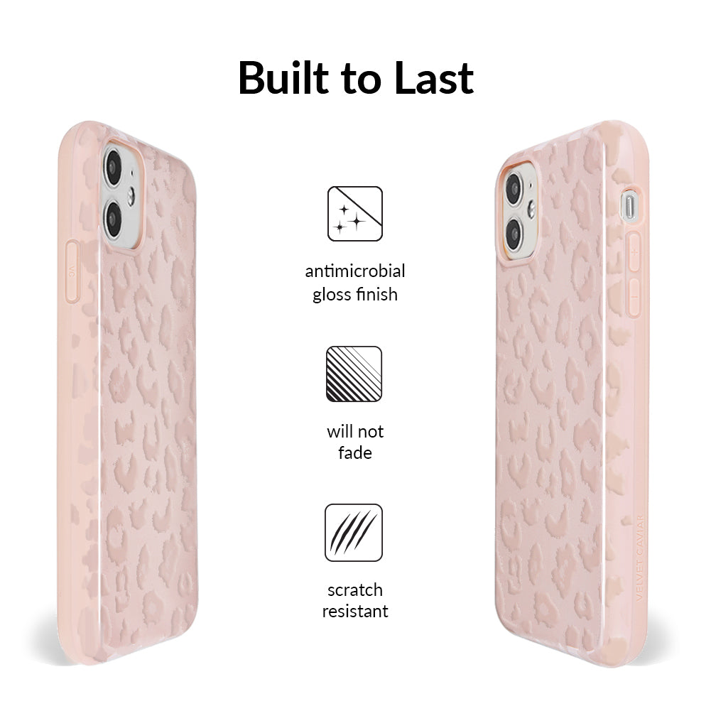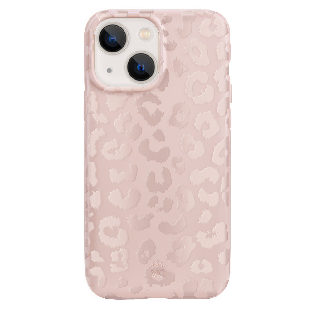 Take a walk on the wild side! This protective case features a matte nude base with gloss leopard print spots. This style does not feature an interior velvet lining. Built in MagSafe ring is only available for iPhone 12 and 13 models. Available with matching grip rings and AirPod cases!