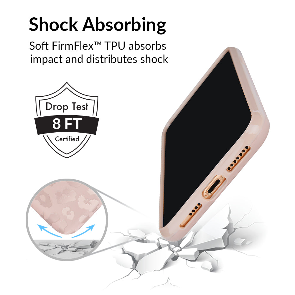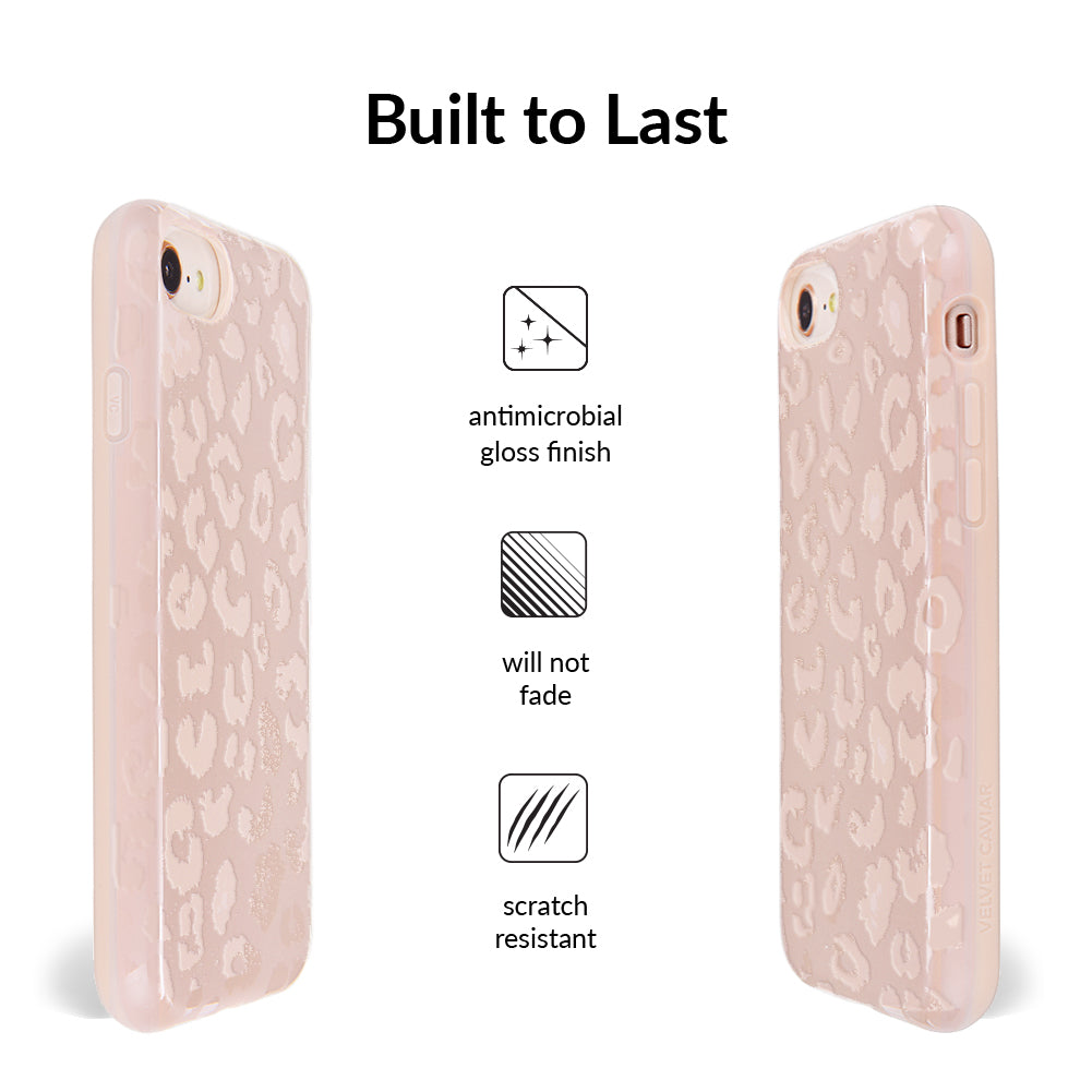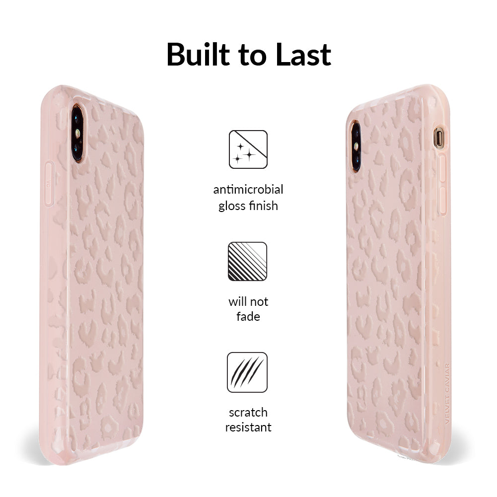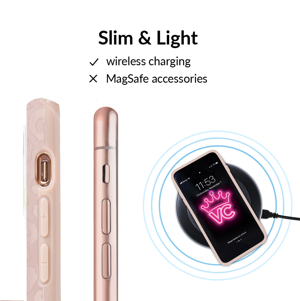 Take a walk on the wild side! This protective case features a matte nude base with gloss leopard print spots. This style does not feature an interior velvet lining. Built in MagSafe ring is only available for iPhone 12 and 13 models. Available with matching grip rings and AirPod cases!