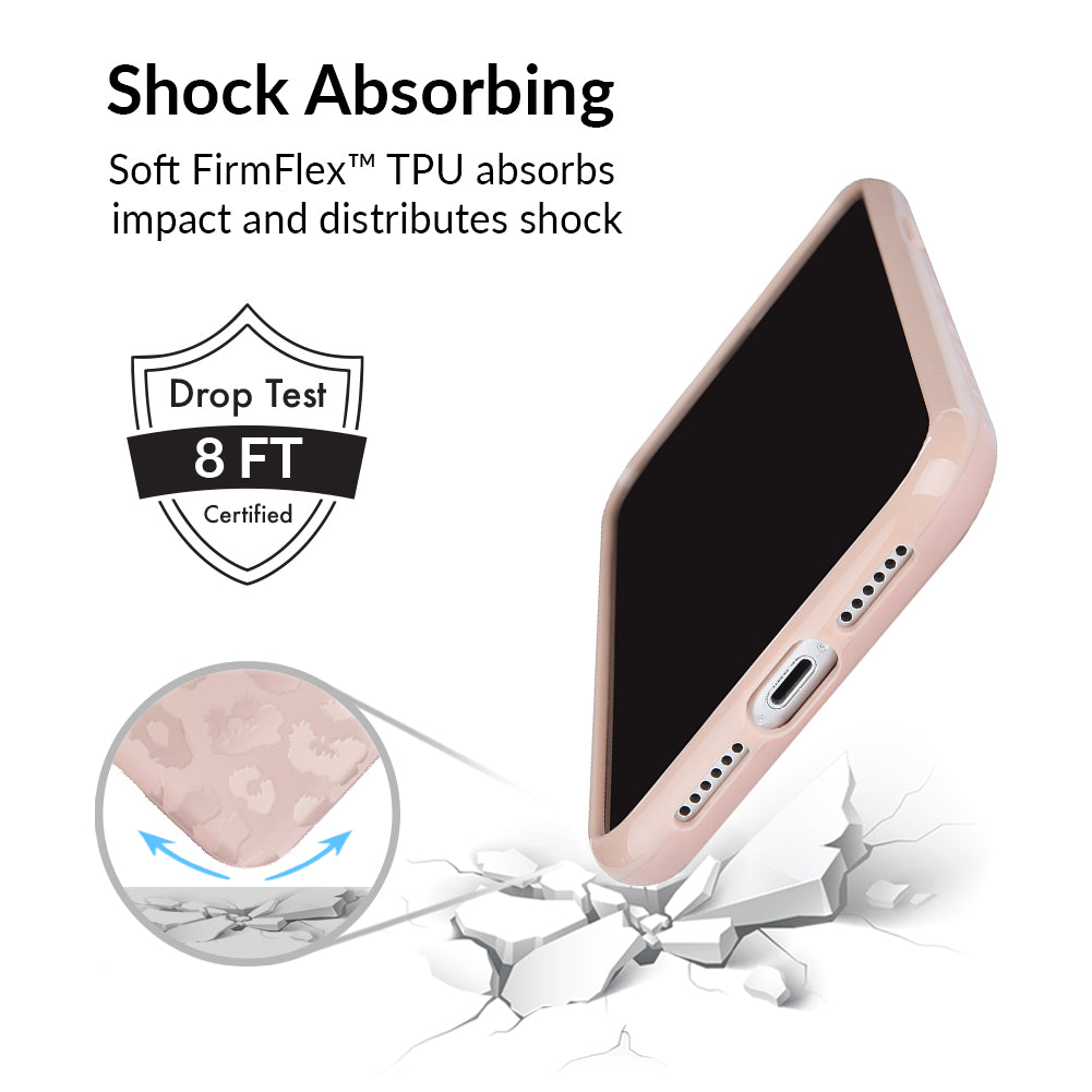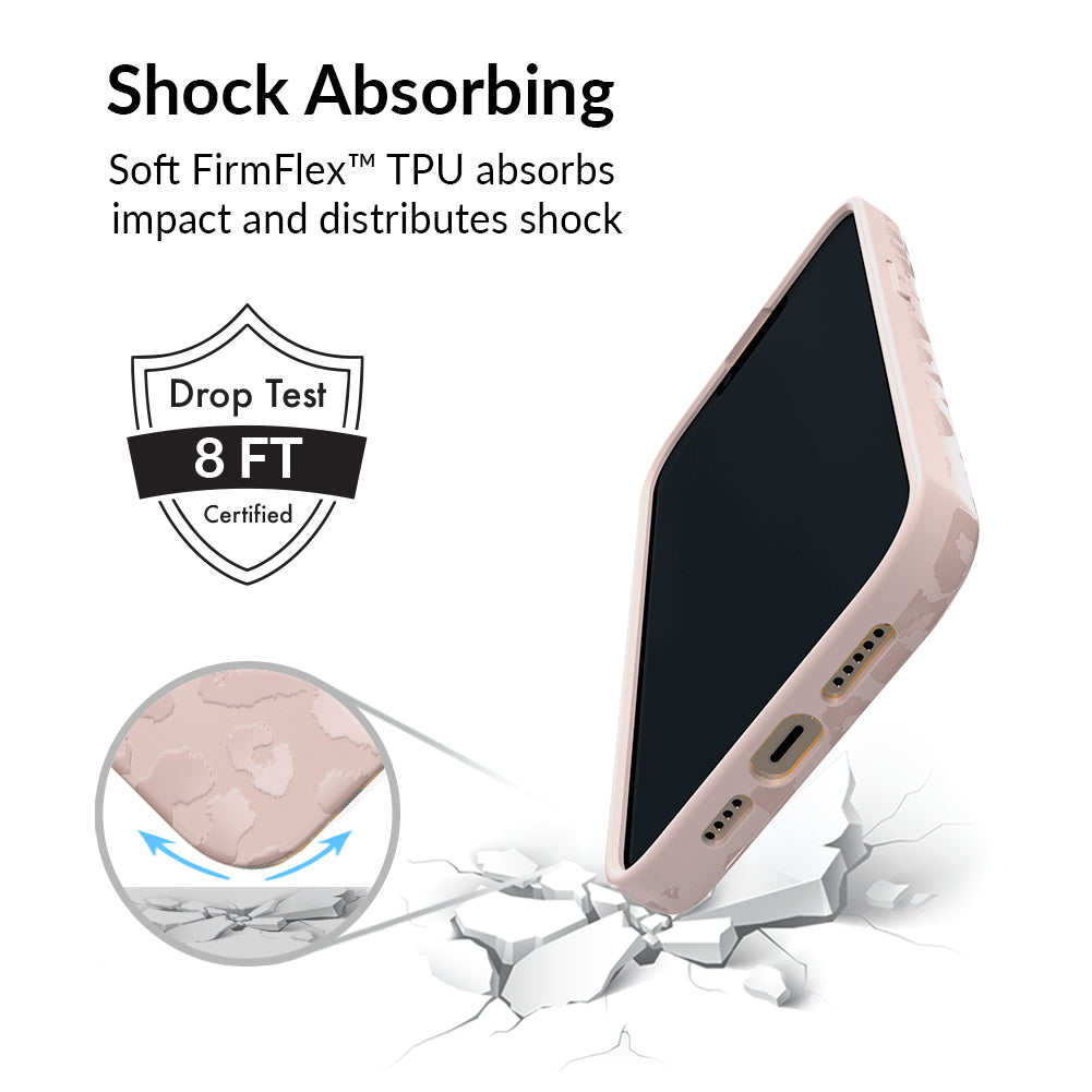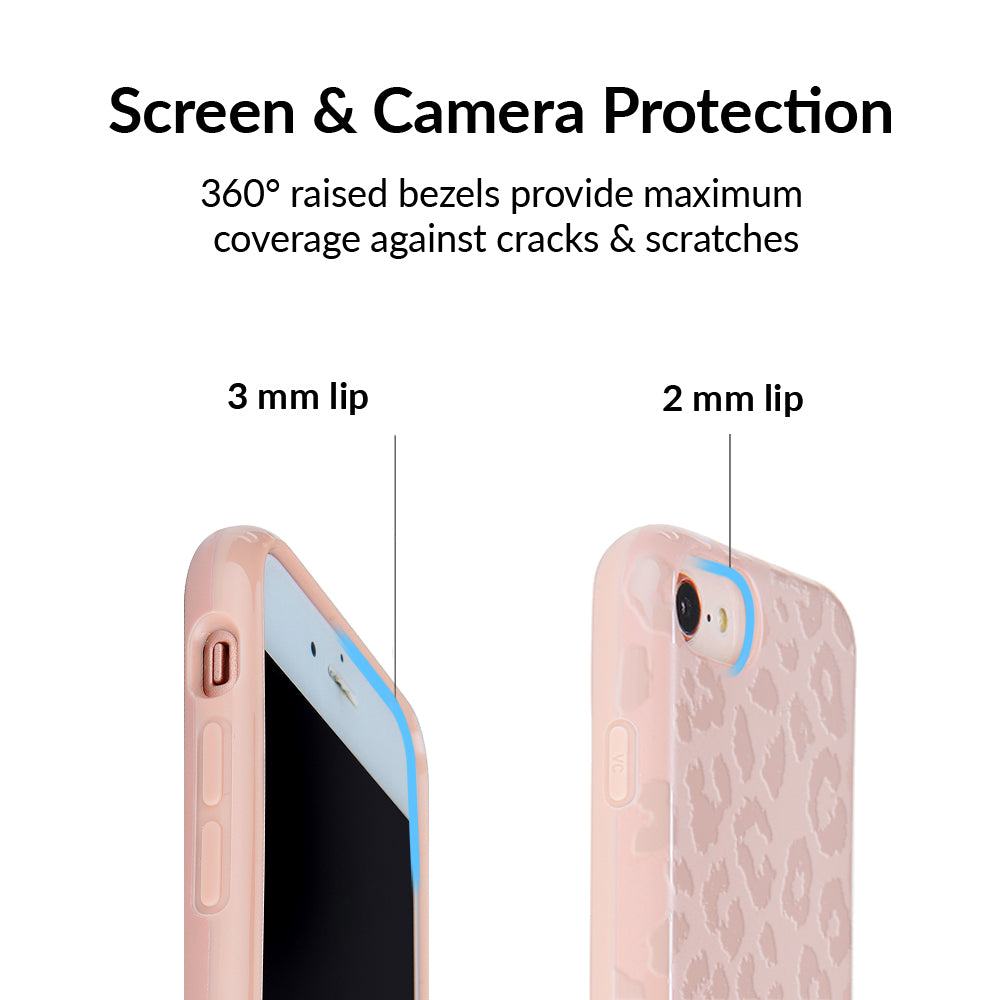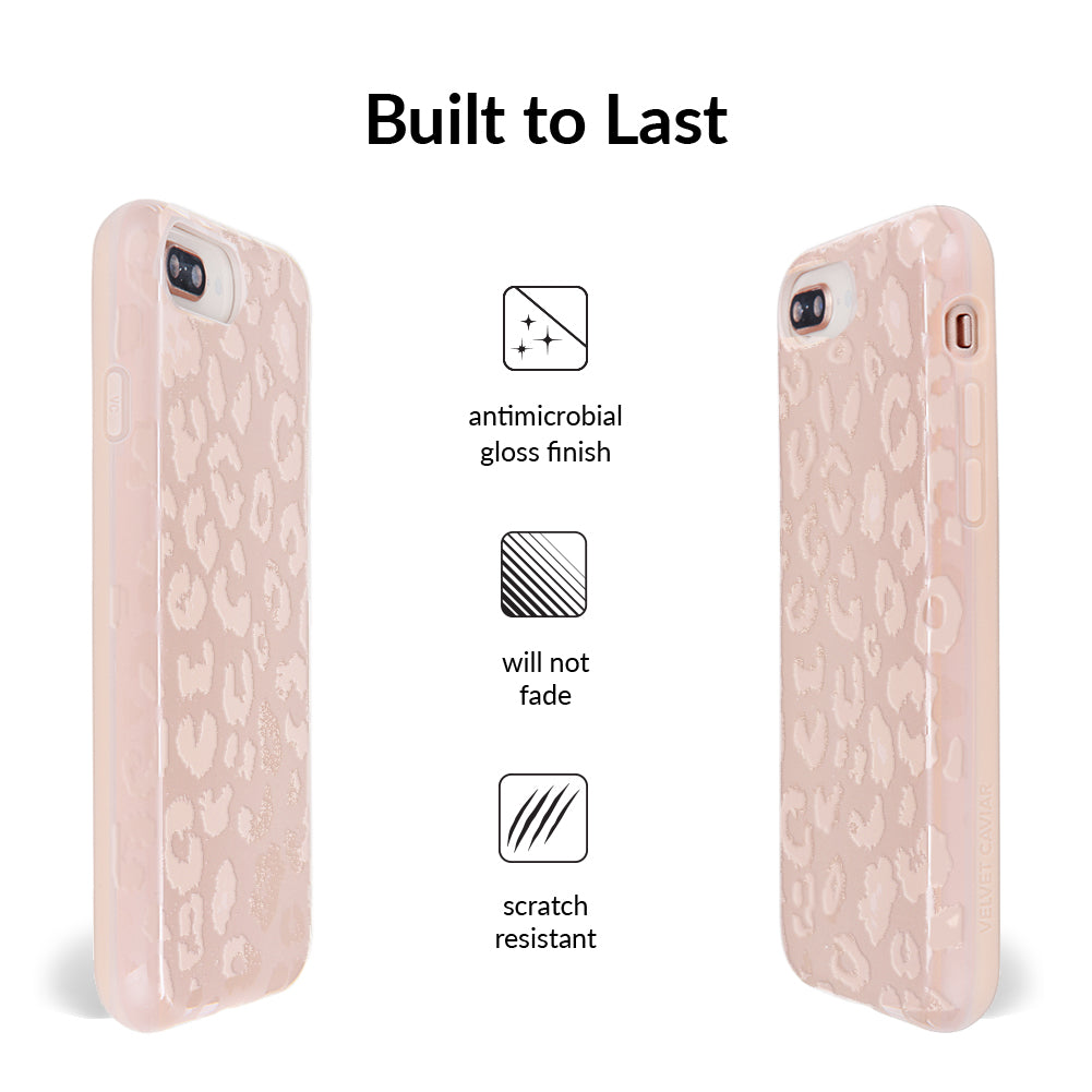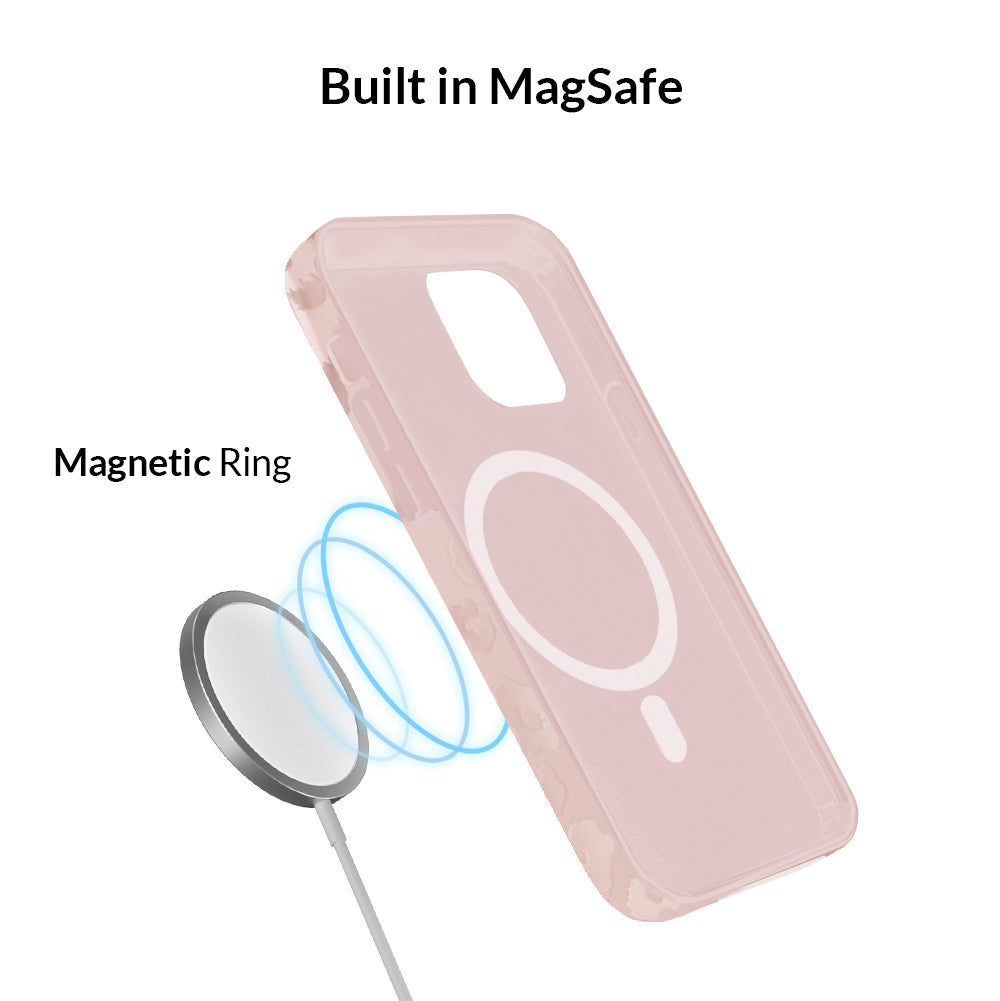 Take a walk on the wild side! This protective case features a matte nude base with gloss leopard print spots. This style does not feature an interior velvet lining. Built in MagSafe ring is only available for iPhone 12 and 13 models. Available with matching grip rings and AirPod cases!