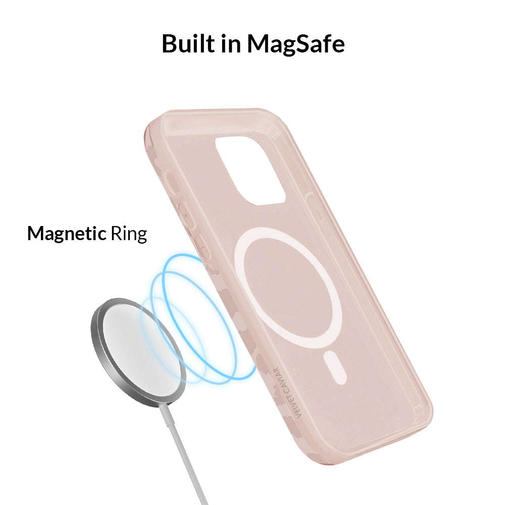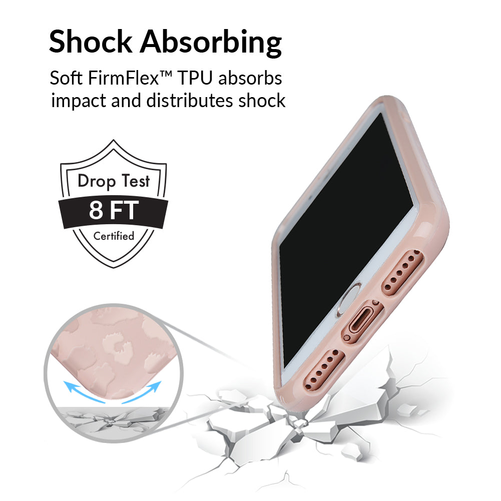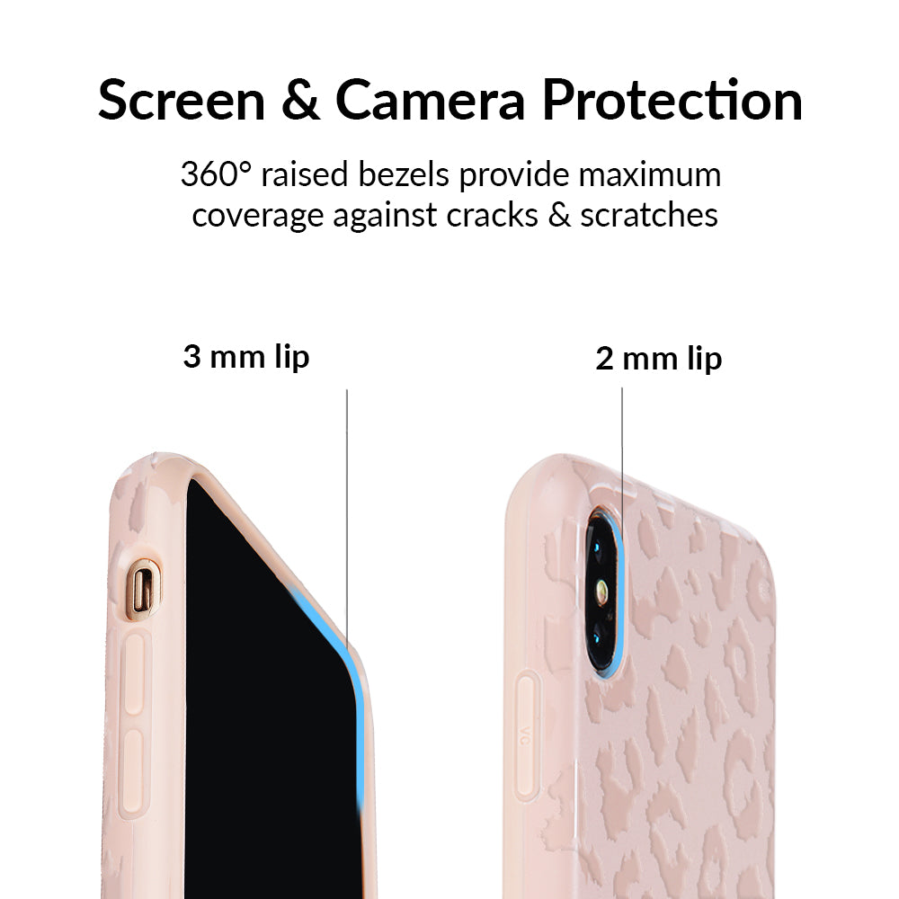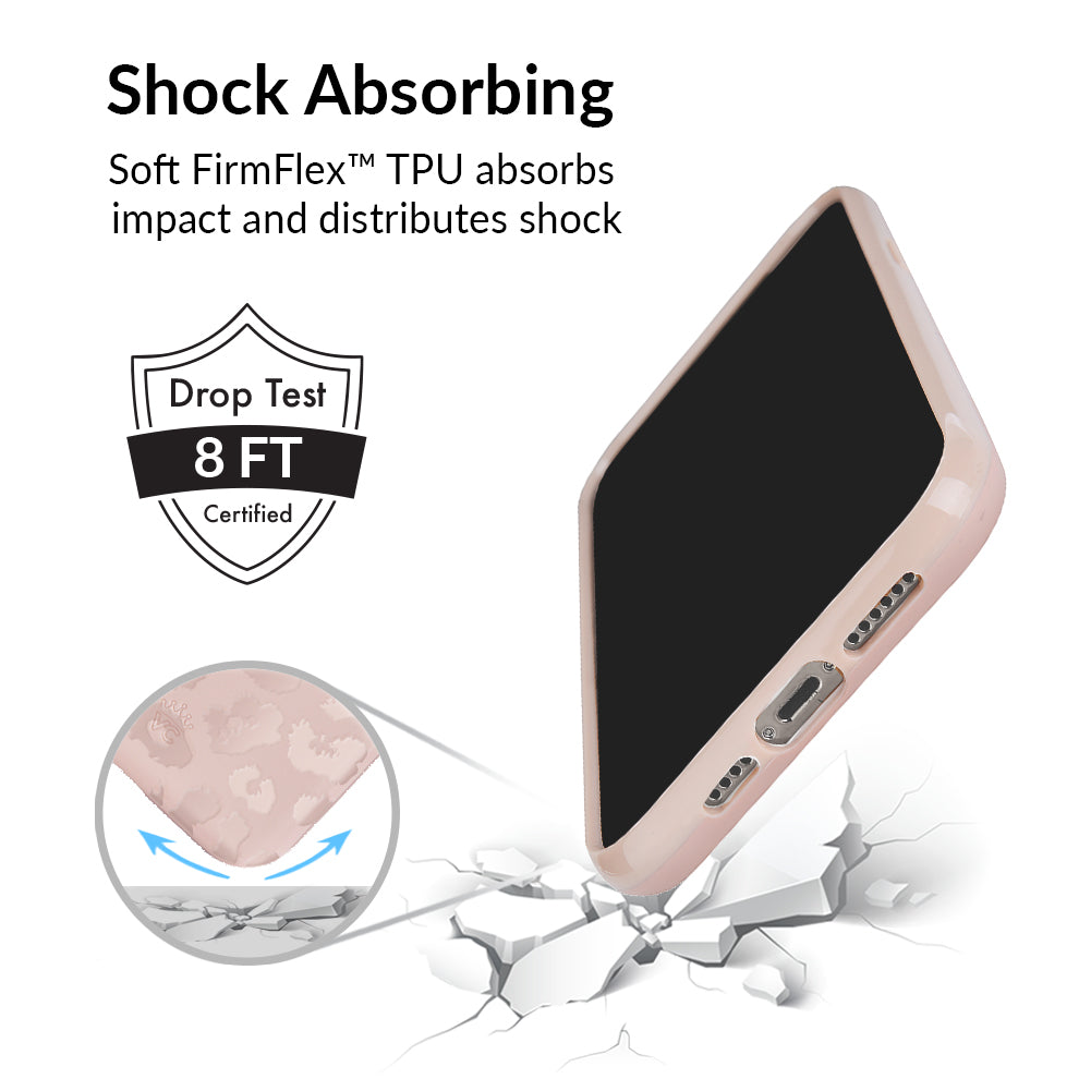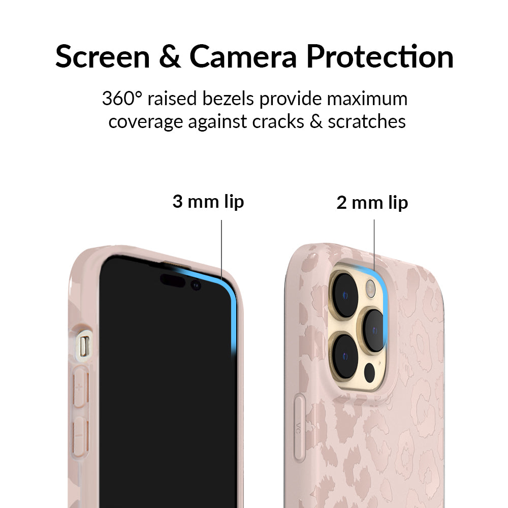 Take a walk on the wild side! This protective case features a matte nude base with gloss leopard print spots. This style does not feature an interior velvet lining. Built in MagSafe ring is only available for iPhone 12 and 13 models. Available with matching grip rings and AirPod cases!