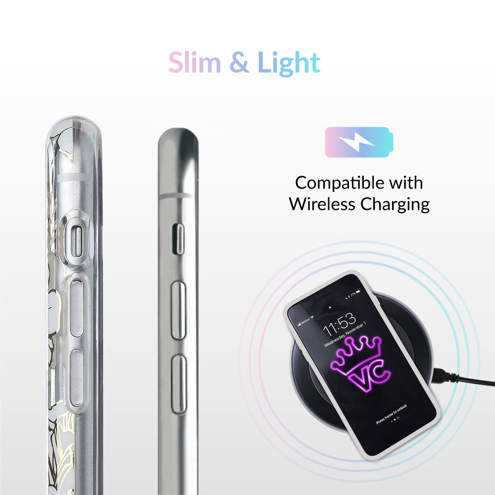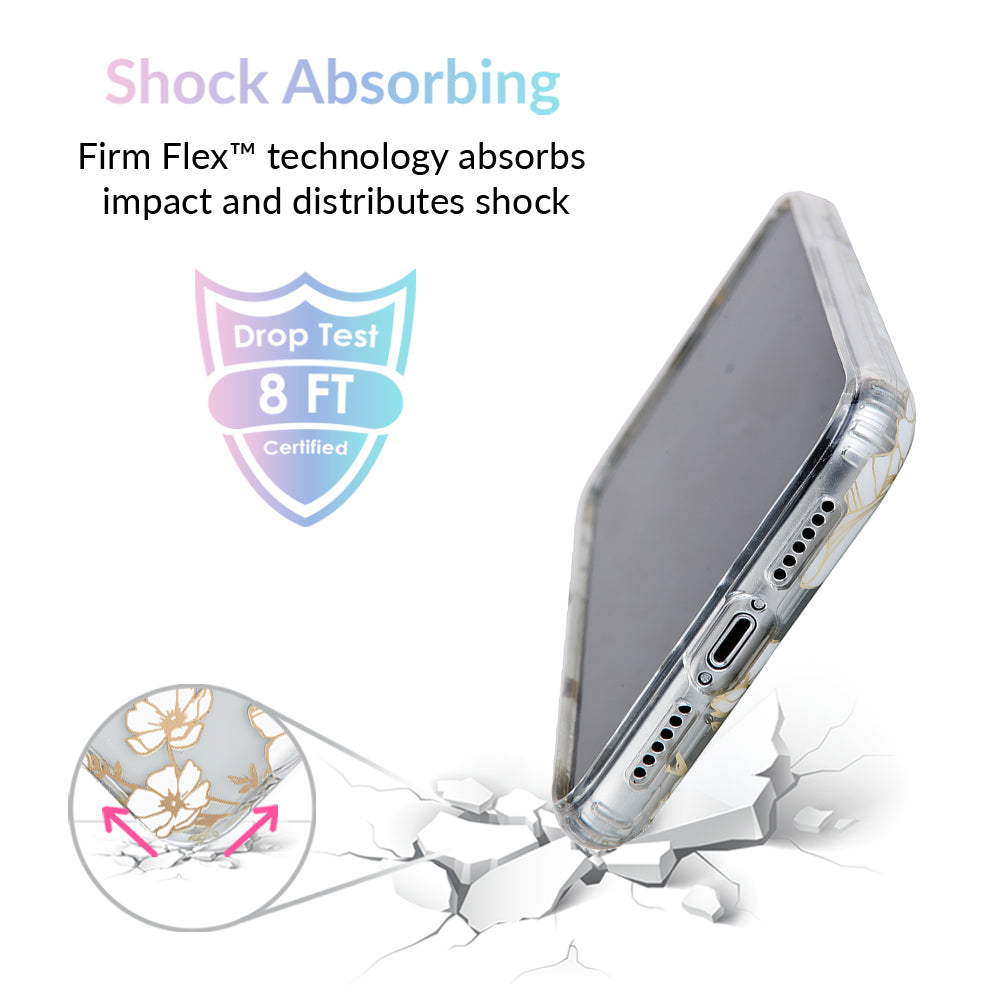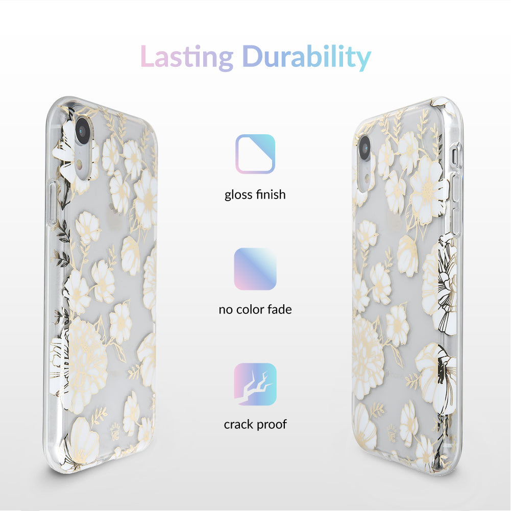 Inspired by beautiful summer bouquets that breath life into any room. This protective clear case is covered in beautiful, hand drawn flowers with delicate, metallic gold detailing.